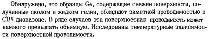 Обнаружено, что образцы Ge, содержащие свежие поверхности, полученные сколом в жидком гелии, обладают заметной проводимостью в $34 диапазоне. В ряде случаев эта поверхностная лроводимость может намного превышать объемную. Исследованы температурные зависимости поверхностной проводимости.