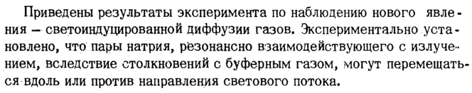 Приведены результаты эксперимента по наблюдению нового явле -ния светоиндуцированной диффузии газов. Экспериментально установлено, что пары натрия, резонансно взаимодействующего с излучением, вследствие столкновений с буферным газом, могут перемещать ся вдоль или против направления светового потока.