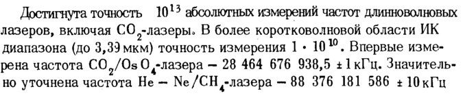 Достигнута точность 1013 абсолютных измерений частот длинноволновых лазеров, включая С02-лазерьь В более коротковолновой области ИК диапазона (до 3,39 мкм) точность измерения 1 · 1010. Впервые измерена частота C02/Os 04-лазера 28 464 676 938,5 ±1кГц. Значительно уточнена частота Не Ne/CH^-лазера 88 376 181 586 ± 10 кГц