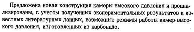 Предложена новая конструкция камеры высокого давления и проанализированы, с учетом полученных экспериментальных результатов и из* вестных литературных данных, возможные режимы работы камервысокого давления, изготовленных из карбонадо.