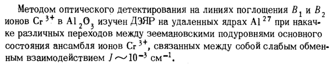 Методом оптического детектирования на линиях поглощения Βχ и В2 ионов Сг3+ в А12©3 изучен ДЭЯР на удаленных ядрах А127 при накачке различных переходов между зеемановскими подуровнями основного состояния ансамбля ионов Сг3+, связанных между собой слабым обменным взаимодействием /^10~3 см"1.