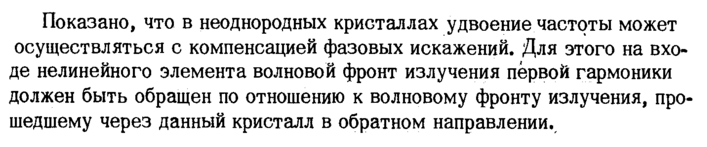 Показано, что в неоднородных кристаллах удвоение частоты может осуществляться с компенсацией фазовых искажений. Для этого на входе нелинейного элемента волновой фронт излучения первой гармоники должен быть обращен по отношению к волновому фронту излучения, прошедшему через данный кристалл в обратном направлении.