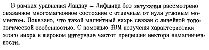 В рамках уравнения Ландау Лифшица без затухания рассмотрено связанное многомагнонное состояние с отличным от нуля угловым моментом. Показано, что такой магнитный вихрь связан с линейной топологической особенностью. С помощью ЭВМ получены характеристики этого вихря в широком интервале частот прецессии вектора намагниченности.