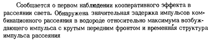Сообщается о первом наблюдении кооперативного эффекта в рассеянии света. Обнаружена значительная задержка импульсов комбинационного рассеяния в водороде относительно максимума возбуждающего импульса с крутым передним фронтом и временная структура импульса рассеяния