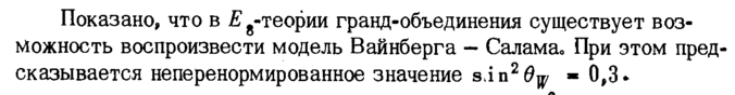 Показано, что в £8-теории гранд-объединения существует возможность воспроизвести модель Вайнберга Салама, При этом предсказывается неперенормированное значение sin20^ 0,3*