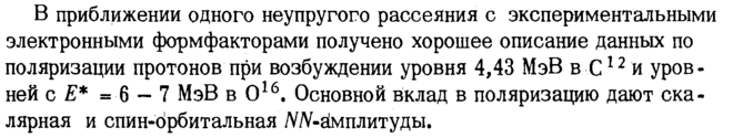 В приближении одного неупругого рассеяния с экспериментальными электронными формфакторами получено хорошее описание данных по поляризации протонов при возбуждении уровня 4,43 МэВ в С12 и уровней с £* = 6 7 МэВ в О16. Основной вклад в поляризацию дают скалярная и спин-орбитальная №У-а1мплитуды.