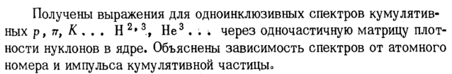 Получены выражения для одноинклюзивных спектров кумулятивных р, тг, К , . . Η 2> 3, Не3 · . ; через одночастичную матрицу плотности нуклонов в ядре. Объяснены зависимость спектров от атомного номера и импульса кумулятивной частицьь