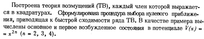 Построена теория возмущений (ТВ), каждый член которой выражается в квадратурах. Сформулирована процедура выбора нулевого приближения, приводящая к быстрой сходимости ряда ТВ. В качестве примера вычислены основное и первое возбужденное состояния в потенциале V(x) == = х2п (п -2, 3, 4).