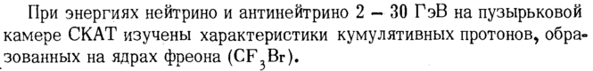 При энергиях нейтрино и антинейтрино 2 — 30 ГэВ на пузырьковой камере СКАТ изучены характеристики кумулятивных протонов, образованных на ядрах фреона (CF.Br).