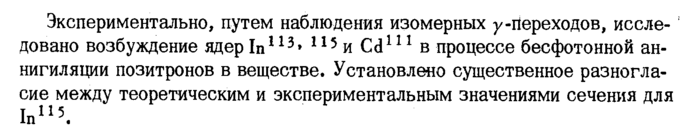 Экспериментально, путем наблюдения изомерных у-Цереходов, исследовано возбуждение ядер In113» 115 и Cd111 в процессе бесфотонной аннигиляции позитронов в веществе. Установлено существенное разногласие между теоретическим и экспериментальным значениями сечения для In115.