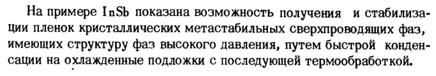 На примере InSb показана возможность получения и стабилизации пленок кристаллических метастабильных сверхпроводящих фаз, имеющих структуру фаз высокого давления, путем быстрой конденсации на охлажденные подложки с последующей термообработкой.