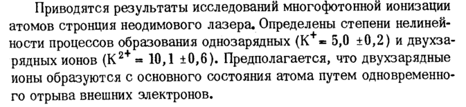 Приводятся результаты исследований многофотонной ионизации атомов стронция неодимового лазера. Определены степени нелинейности процессов образования однозарядных (К+~ 5,0 ±0,2) и двухза-рядных ионов (К2+« 10,1 ±0,6). Предполагается, что двухзарядные ионы образуются с основного состояния атома путем одновременного отрыва внешних электронов.