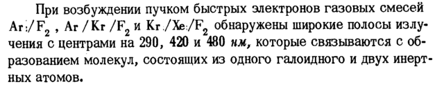 При возбуждении пучком быстрых электронов газовых смесей Ar:/F2 , Аг / Кг /F2 и Kr ,/Xe;/F2 обнаружены широкие полосы излучения с центрами на 290 , 420 и 480 нм, которые связываются с образованием молекул, состоящих из одного галоидного и двух инерт ных атомов.