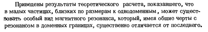 Приведены результаты теоретического расчета, показавшего, что в малых частицах, близких по размерам к однодоменным, может существовать особый вид магнитного резонанса, который, имея общие черты с резонансом в доменных границах, существенно отличается от последнего.