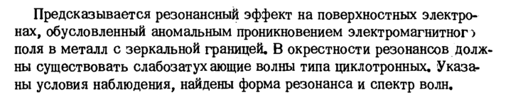 Предсказывается резонансный эффект на поверхностных электронах, обусловленный аномальным проникновением электромагнитног > поля в металл с зеркальной границей. В окрестности резонансов должны существовать слабозатух ающие волны типа циклотронных. Указаны условия наблюдения, найдены форма резонанса и спектр волн.