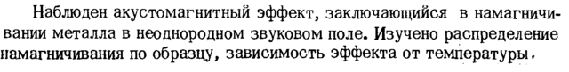 Наблюден акустомагнитный эффект, заключающийся в намагничивании металла в неоднородном звуковом поле. Изучено распределение намагничивания по образцу, зависимость эффекта от температуры.