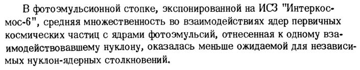 В фото эмульсионной стопке, экспонированной на ИСЗ "Интеркос-мос-6", средняя множественность во взаимодействиях ядер первичных космических частиц с ядрами фотоэмульсий, отнесенная к одному взаимодействовавшему нуклону, оказалась меньше ожидаемой для независимых нуклон-ядерных столкновений.