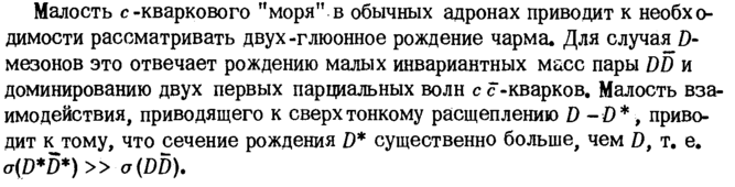 Малость с-кваркового "моря" в обычных адронах приводит к необходимости рассматривать двух-глюонное рождение чарма. Для случая D-мезонов это отвечает рождению малых инвариантных масс пары DD и доминированию двух первых парциальных волн с с -кварков. Малость взаимодействия, приводящего к сверхтонкому расщеплению D -D*, приводит к тому, что сечение рождения D* существенно больше, чем D, т. е. a(D*D*)» o(DD).