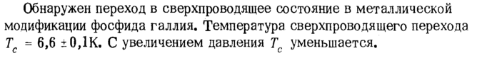 Обнаружен переход в сверхпроводящее состояние в металлической модификации фосфида галлия. Температура сверхпроводящего перехода Τ = 6,6 ±0,1К. С увеличением давления Τ уменьшается.