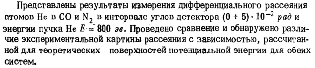 Представлены результаты измерения дифференциального рассеяния атомов Не в СО и N2 в интервале углов детектора (0 + 5) · 10~2 рад и энергии пучка Не £-«80.0 эв. Проведено сравнение и обнаружено различие экспериментальной картины рассеяния с зависимостью, рассчитанной для теоретических поверхностей потенциальной энергии для обеих систем.