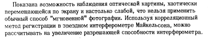 Показана возможность наблюдения оптической картины, хаотически перемещающейся по экрану и настолько слабой, что нельзя применить обычный способ "мгновенной" фотографии. Используя корреляционный метод регистрации в звездном интерферометре Майкельсона, можно рассчитывать на увеличение разрешающей способности интерферометра,