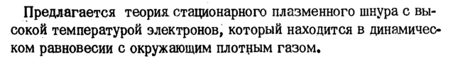 Предлагается теория стационарного плазменного шнура с высокой температурой электронов, который находится в динамическом равновесии с окружающим плотным газом.