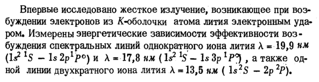 Впервые исследовано жесткое излучение, возникающее при возбуждении электронов из Х-оболочки атома лития электронным ударом. Измерены энергетические зависимости эффективности возбуждения спектральных линий однократного иона лития λ =19,9 им , а также одной линии двухкратного иона лития λ = 13,5 нм (ls2S 2р 2Р).