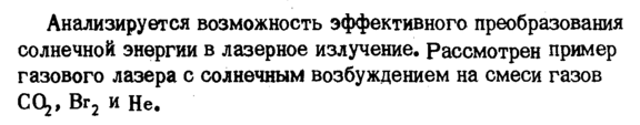 Анализируется возможность эффективного преобразования солнечной энергии в лазерное излучение. Рассмотрен пример газового лазера с солнечным возбуждением на смеси газов Щ, Вг2 и Не.