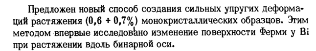 Предложен новый способ создания сильных упругих деформаций растяжения (0,6 + 0,7%) монокристаллических образцов. Этим методом впервые исследовкно изменение поверхности Ферми у Bi при растяжении вдоль бинарной оси.