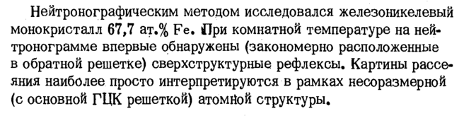 Нейтронографическим методом исследовался железоникелевый монокристалл 67,7 ат.% Fe. При комнатной температуре на ней-тронограмме впервые обнаружены (закономерно расположенные в обратной решетке) сверхструктурные рефлексы. Картины рассеяния наиболее просто интерпретируются в рамках несоразмерной (с основной ГЦК решеткой) атомной структуры.