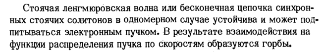Стоячая ленгмюровская волна или бесконечная цепочка синхронных стоячих солитонов в одномерном случае устойчива и может под-питываться электронным пучком. В результате взаимодействия на функции распределения пучка по скоростям образуются горбы.