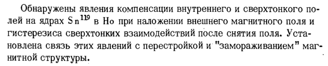 Обнаружены явления компенсации внутреннего и сверхтонкого полей на ядрах Sn119 в Но при наложении внешнего магнитного поля и гистерезиса сверхтонких взаимодействий после снятия поля. Установлена связь этих явлений с перестройкой и "замораживанием" маг нитной структуры.