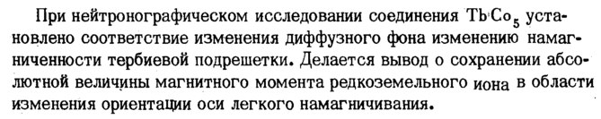 При нейтронографическом исследовании соединения ТЬСо5 установлено соответствие изменения диффузного фона изменению намагниченности тербиевой подрешетки. Делается вывод о сохранении абсолютной величины магнитного момента редкоземельного иона в области изменения ориентации оси легкого намагничивания.