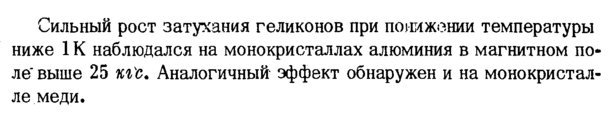Сильный рост затухания геликонов при понижении температуры ниже 1К наблюдался на монокристаллах алюминия в магнитном по* ле" выше 25 кгЪ. Аналогичный эффект обнаружен и на монокристалле меди.