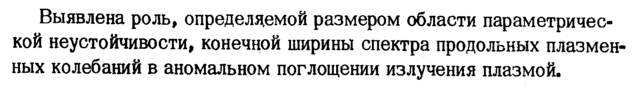 Выявлена роль, определяемой размером области параметрической неустойчивости, конечной ширины спектра продольных плазменных колебаний в аномальном поглощении излучения плазмой.