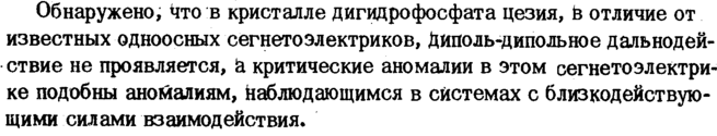 Обнаружено, ^то в кристалле дигидрофосфата цезия, b отличие от известных одноосных сегнетоэлектриков, Диполь-дипольное дальнодействие не проявляется, а критические аномалии в этом сегнетоэлектри ке подобны аномалиям, Наблюдающимся в сйстемах с близкодействующими силами взаимодействия.