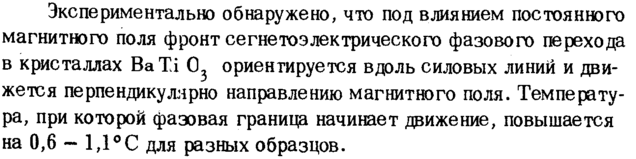 Экспериментально обнаружено, что под влиянием постоянного магнитного поля фронт сегнетоэлектрического фазового перехода в кристаллах BaTi 03 ориентируется вдоль силовых линий и движется перпендикулярно направлению магнитного поля. Температура, при которой фазовая граница начинает движение, повышается на 0,6 1,1° С для разных образцов.