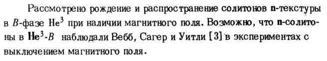 Рассмотрено рождение и распространение солитонов п-текстуры в S-фазе Не3 при наличии магнитного поля. Возможно, что п-солито-ны в Не3-б наблюдали Вебб, Сагер и Уитли [3] в экспериментах с выключением магнитного поля.