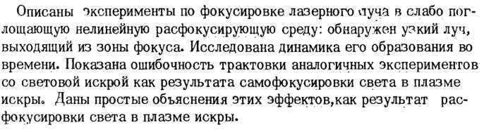 Описаны эксперименты по фокусировке лазерного ауча в слабо поглощающую нелинейную расфокусирующую среду: обнаружен узкий луч, выходящий из зоны фокуса. Исследована динамика его образования во времени. Показана ошибочность трактовки аналогичных экспериментов со световой искрой как результата самофокусировки света в плазме искры* Даны простые объяснения этих эффектов,как результат расфокусировки света в плазме искры.