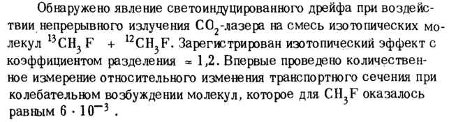Обнаружено явление светоиндуцированного дрейфа при воздействии непрерывного излучения С02-лазера на смесь изотопических молекул 13СН3 F + l2CH3F. Зарегистрирован изотопический эффект с коэффициентом разделения =1,2. Впервые проведено количественное измерение относительного изменения транспортного сечения при колебательном возбуждении молекул, которое для CH3F оказалось равным 6 · 10~3 .