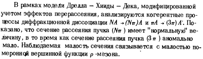 В рамках модели Дрелла Хииды Дека, модифицированной учетом эффектов пере рассеяния, анализируются когерентные процессы диффракционной диссоциации ΝΑ ·+(Νπ)Α и πΑ -+ (3π}Α'. Показано, что сечение рассеяния пучка (Νπ ) имеет "нормальную1 величину, в то время как сечение рассеяния пучка β π ) аномально мало. Наблюдаемая малость сечения связывается с малостью по-меронндй вершинной функции ρ -мезона.