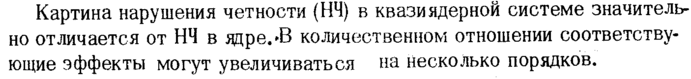 Картина нарушения четности (НЧ) в квазиядерной системе значительно отличается от НЧ в дцре.43 количественном отношении соответствующие эффекты могут увеличиваться на несколько порядков.
