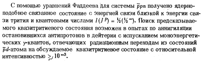С помощью уравнений Фаддеева для системы ррп получено ядерно-подобное связанное состояние с энергией связи близкой к энергии связи трития и квантовыми числами = Поиск предсказываемого квазитритиевого состояния возможен в опытах по аннигиляции остановившихся антипротонов в дейтерии с испусканием моноэнергетических у-квантов, отвечающих радиационшм переходам из состояний рс?-атома на обсуждаемое квазитритиевоесостояние с относительной интенсивностью ^Ю""3.