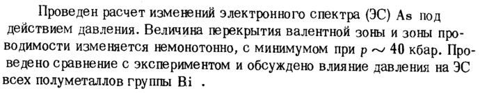 Проведен расчет изменений электронного спектра (ЭС) As под действием давления. Величина перекрытия валентной зоны и зоны проводимости изменяется немонотонно, с минимумом при ρ ^ 40 кбар. Проведено сравнение с экспериментом и обсуждено влияние давления на ЭС всех полуметаллов группы Bi .