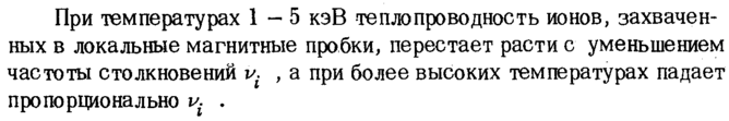 При температурах 1-5 кэВ теплопроводность ионов, захваченных в локальные магнитные пробки, перестает расти с уменьшением частоты столкновений и. , а при более высоких температурах падает пропорционально и. .
