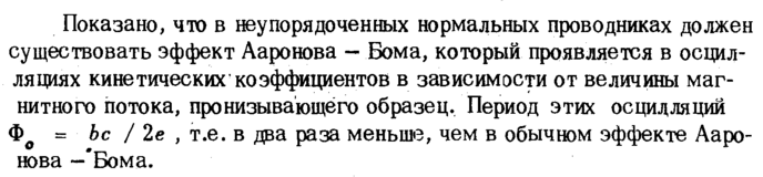 Показано, что в неупорядоченных нормальных проводниках должен существовать эффект Ааронова Бома, который проявляется в осцил-ляциях кинетических'коэффициентов в зависимости от величины магнитного потока, пронизывающего образец. Период этих осцидляций Фо = Ьс / 2е , т.е. в два раза меньше, чем в обычном эффекте Ааронова -'Бома.