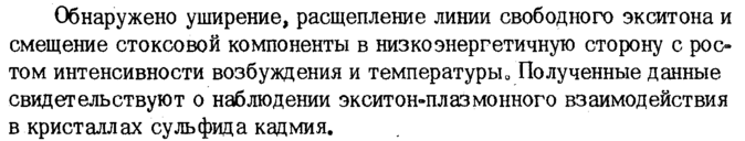 Обнаружено уширение, расщепление линии свободного экситона и смещение стоксовой компоненты в низкоэнергетичную сторону с ростом интенсивности возбуждения и температурьи Полученные данные свидетельствуют о наблюдении экситон-плазмонного взаимодействия в кристаллах сульфида кадмия.