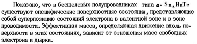 Показано, что в бесщелевых полупроводниках типа aSn, HgTe существуют специфические поверхностные состояния, представляющие собой суперпозицию состояний электрона в валентной зоне и в зоне проводимости* Эффективная масса, определяющая движение вдоль поверхности в этих состояниях, зависит от отношения масс свободных электрона и дырки.