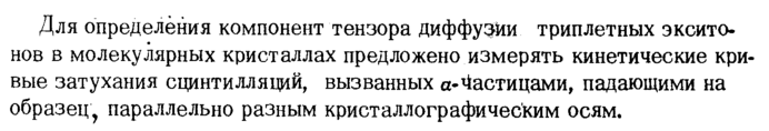Для определения компонент тензора диффузйи триплетных эксито-нов в молекулярных кристаллах предложено измерять кинетические кри-вые затухания сцинтилляций, вызванных α-^астицами, падающими на образец, параллельно разным кристаллографическим осям.
