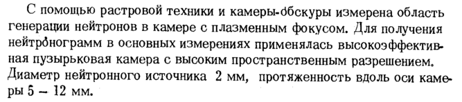 С помощью растровой техники и камеры-обскуры измерена область генерации нейтронов в камере с плазменным фокусом. Для получения нейтрбнограмм в основных измерениях применялась высокоэффективная пузырьковая камера с высоким пространственным разрешением. Диаметр нейтронного источника 2 мм, протяженность вдоль оси камеры 5 — 12 мм.